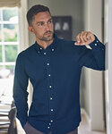 100% Cotton twill garment-washed. Shaped fit. Button-down collar. Fused collar and cuffs. Back yoke with box pleat. Inside hanger loop. Curved hem. Ascolite button wrapping.